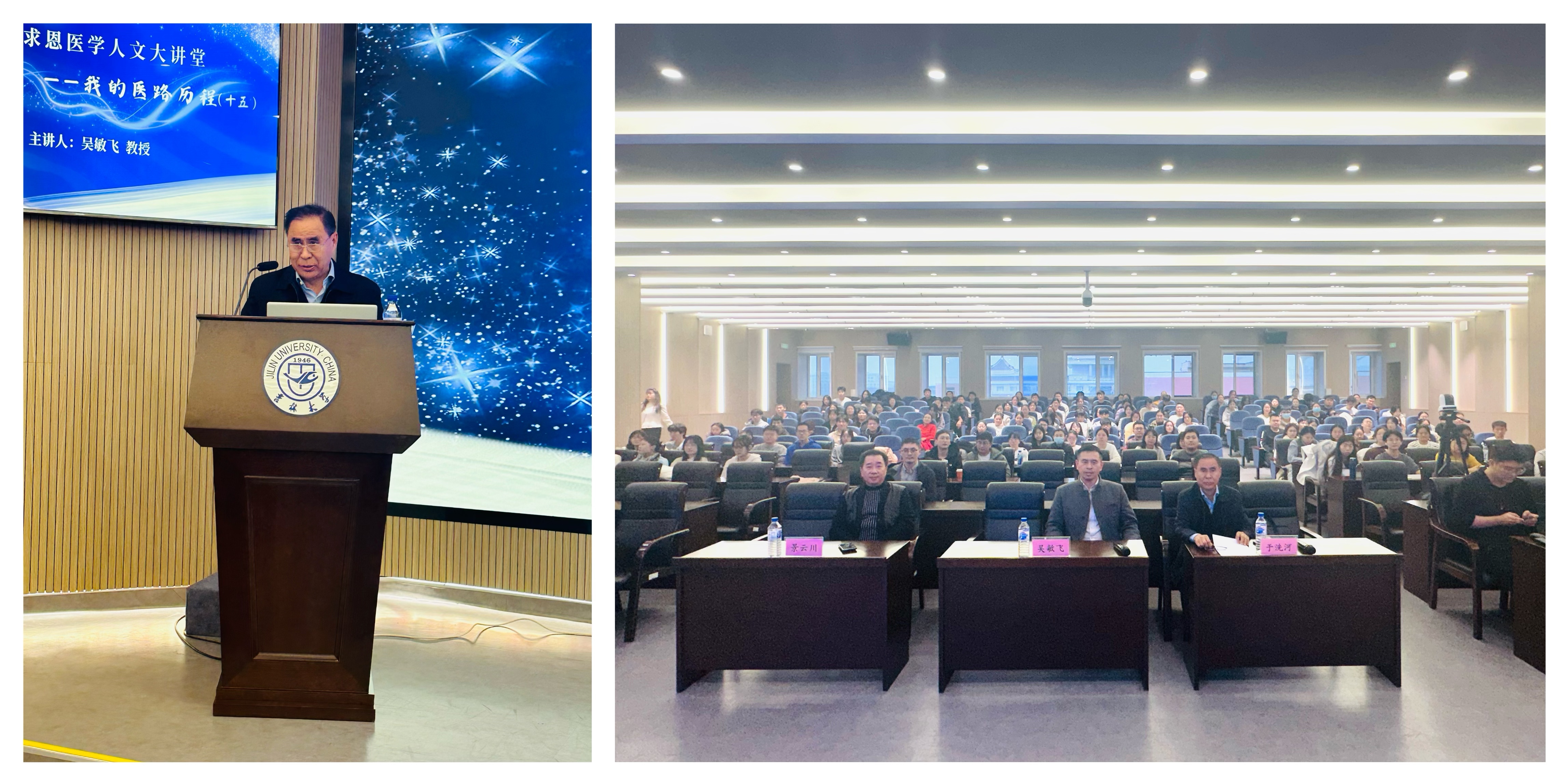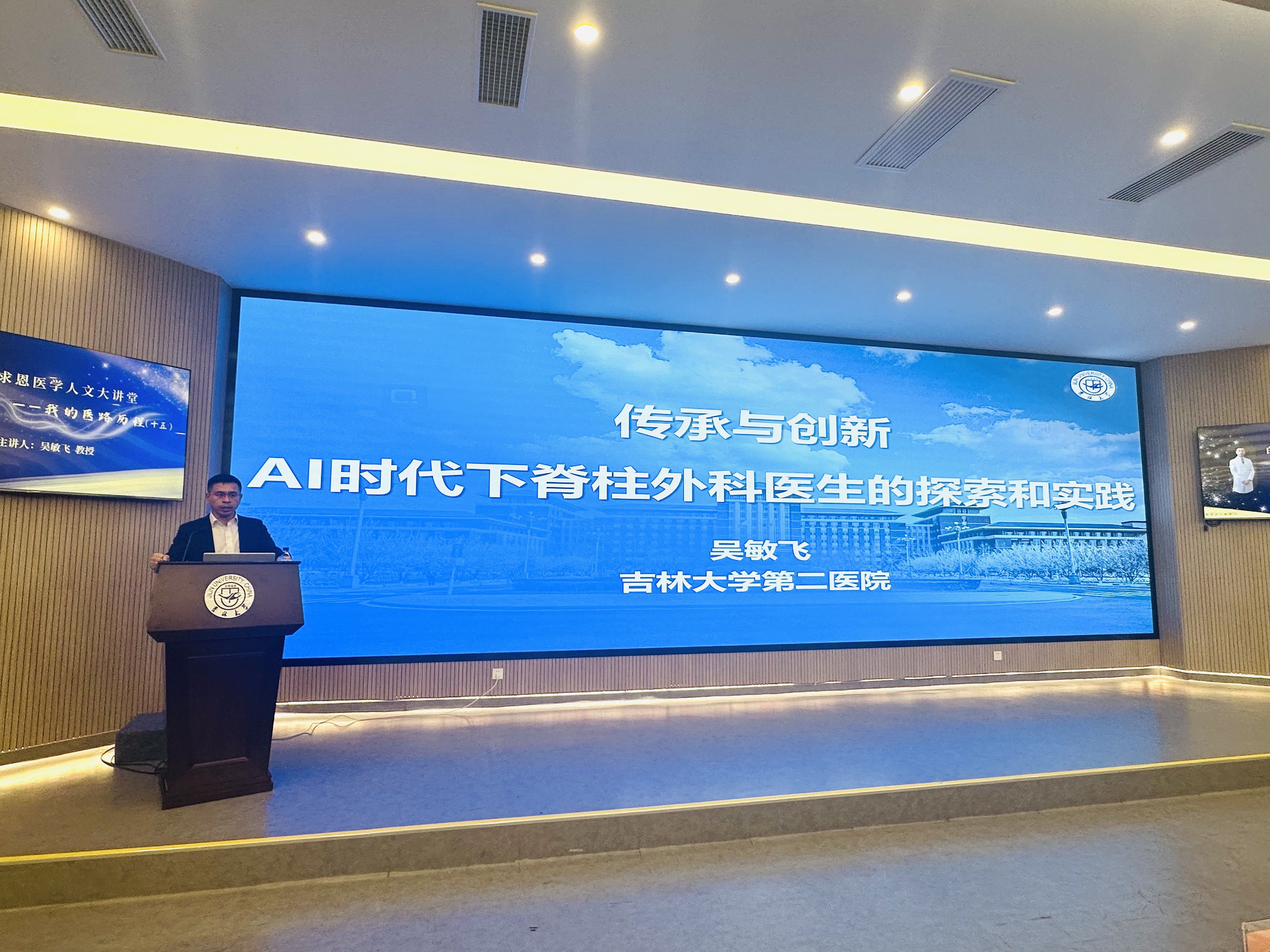 10月29日,由医学部医学人文教育中心举办的白求恩医学人文大讲堂(2025年第7期)之“我的医路历程”第十五期讲座在新民校区第一教学楼白求恩大讲堂举行。本期特邀国家优秀青年医师、吉林大学第二临床医学院吴敏飞教授主讲,来自医学部相关教学单位的 220 余名本科生、研究生和教师代表现场参与活动,活动由医学人文教育中心主任于洗河主持。