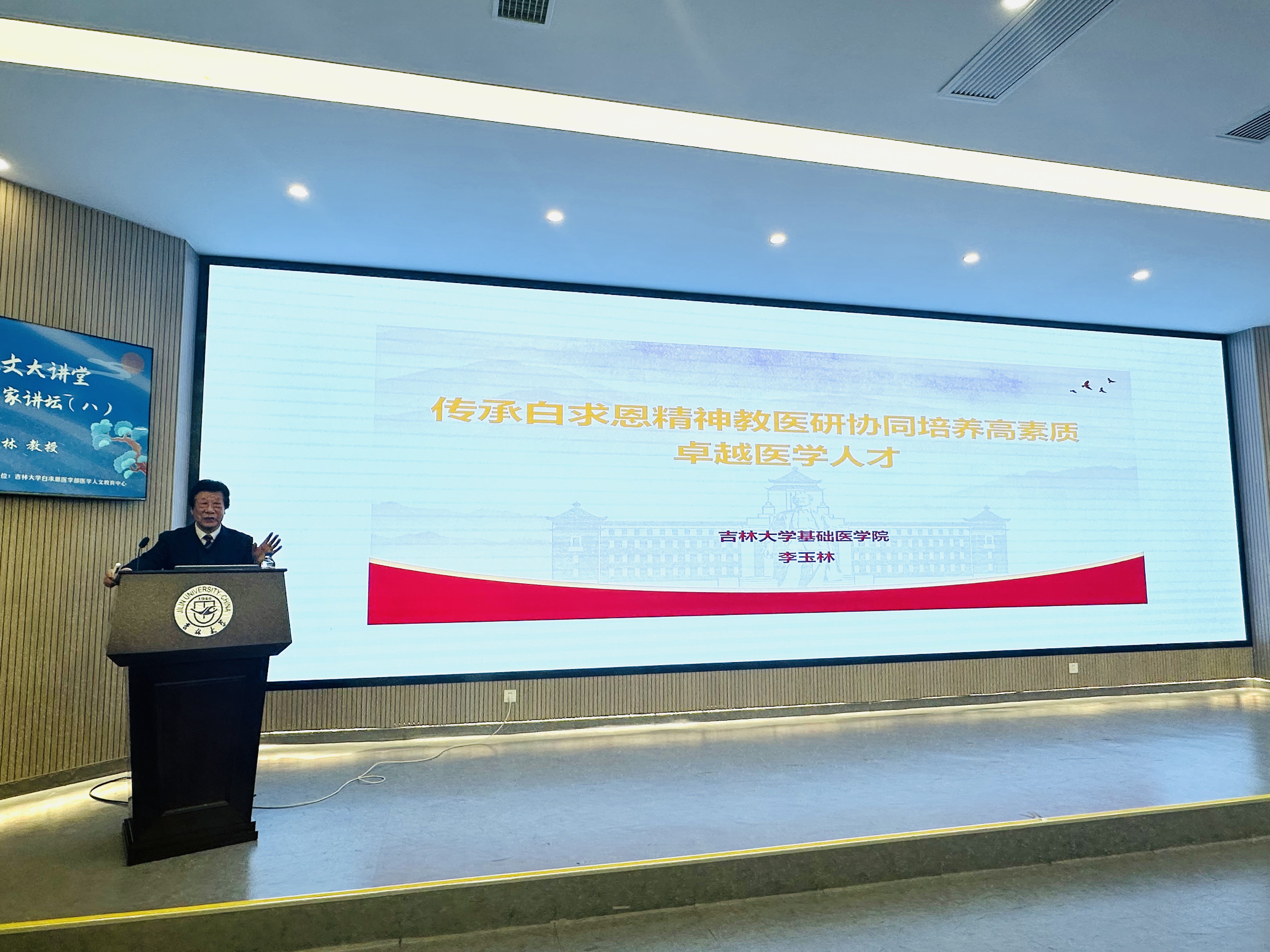 11月12日,由白求恩医学部医学人文教育中心举办的白求恩医学人文大讲堂之“名家讲坛”第8期活动在新民校区第一教学楼白求恩大讲堂成功举办。本期特邀原白求恩医科大学校长、吉林大学原常务副校长李玉林教授担任主讲嘉宾,来自医学部相关教学单位的200余名师生参加活动。活动由医学人文教育中心主任于洗河主持。