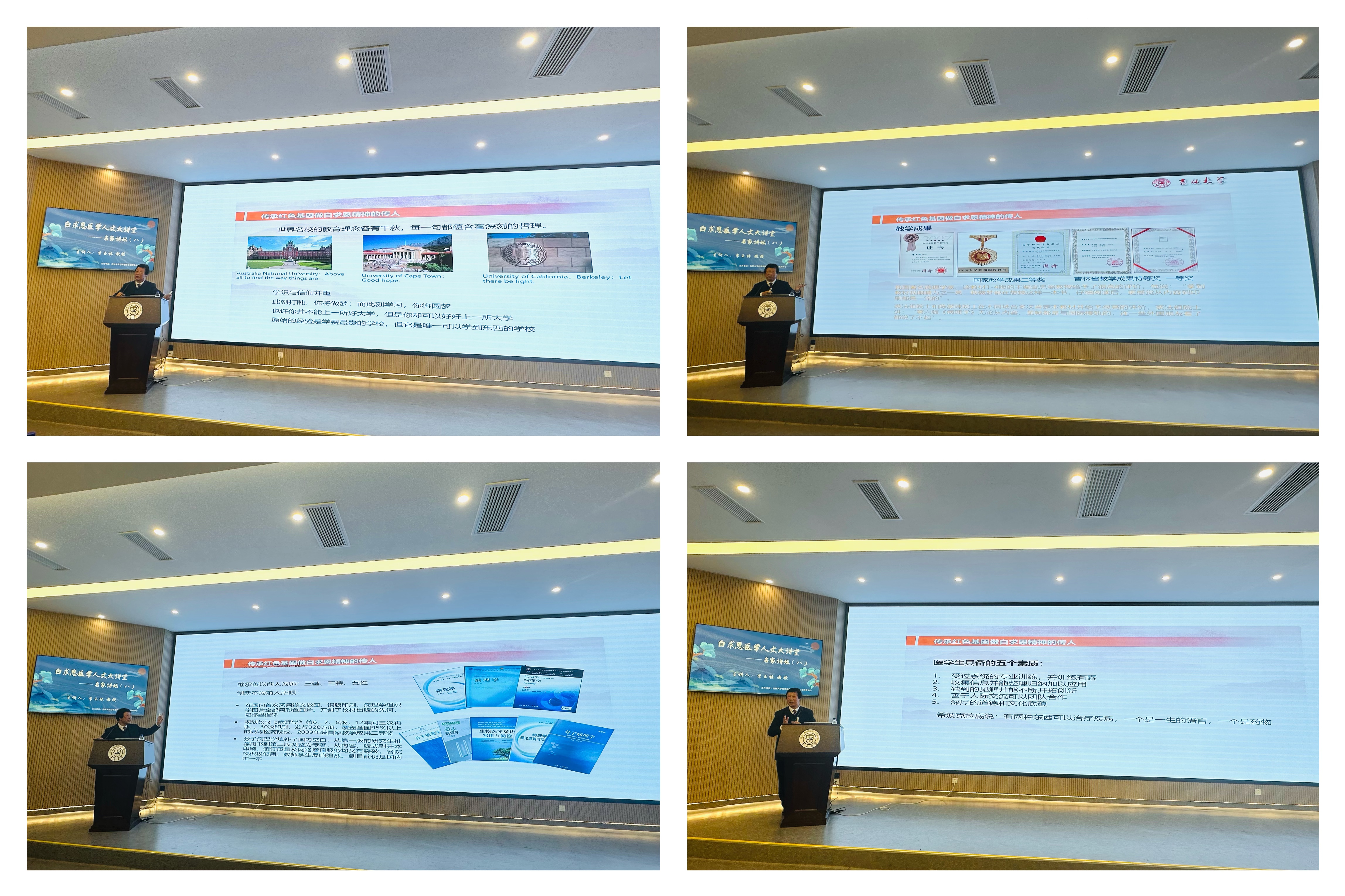 在“传承红色基因做白求恩精神的传人”部分,李玉林教授分享了自己对医学教育的思考。他曾研读50多所世界名校的介绍及定位,深思其先进办学理念,不断探索“为谁培养人”和“怎样培养人”的问题。讲座中李玉林教授向师生们分析了现代医学发展趋势,他引用联合国教科文组织提出的“四个学会”——学会认知、学会做事、学会做人、学会共处,并着重强调医学人文的重要性,指出医学不仅是自然科学和技术科学,更是“人的科学”。他认为人类文明的核心在于人与人之间的关系,医学人文精神体现在了解人、帮助人、爱护人、尊重人,并嘱托师生们要牢记医学生誓言中的“健康所系,性命相托”。