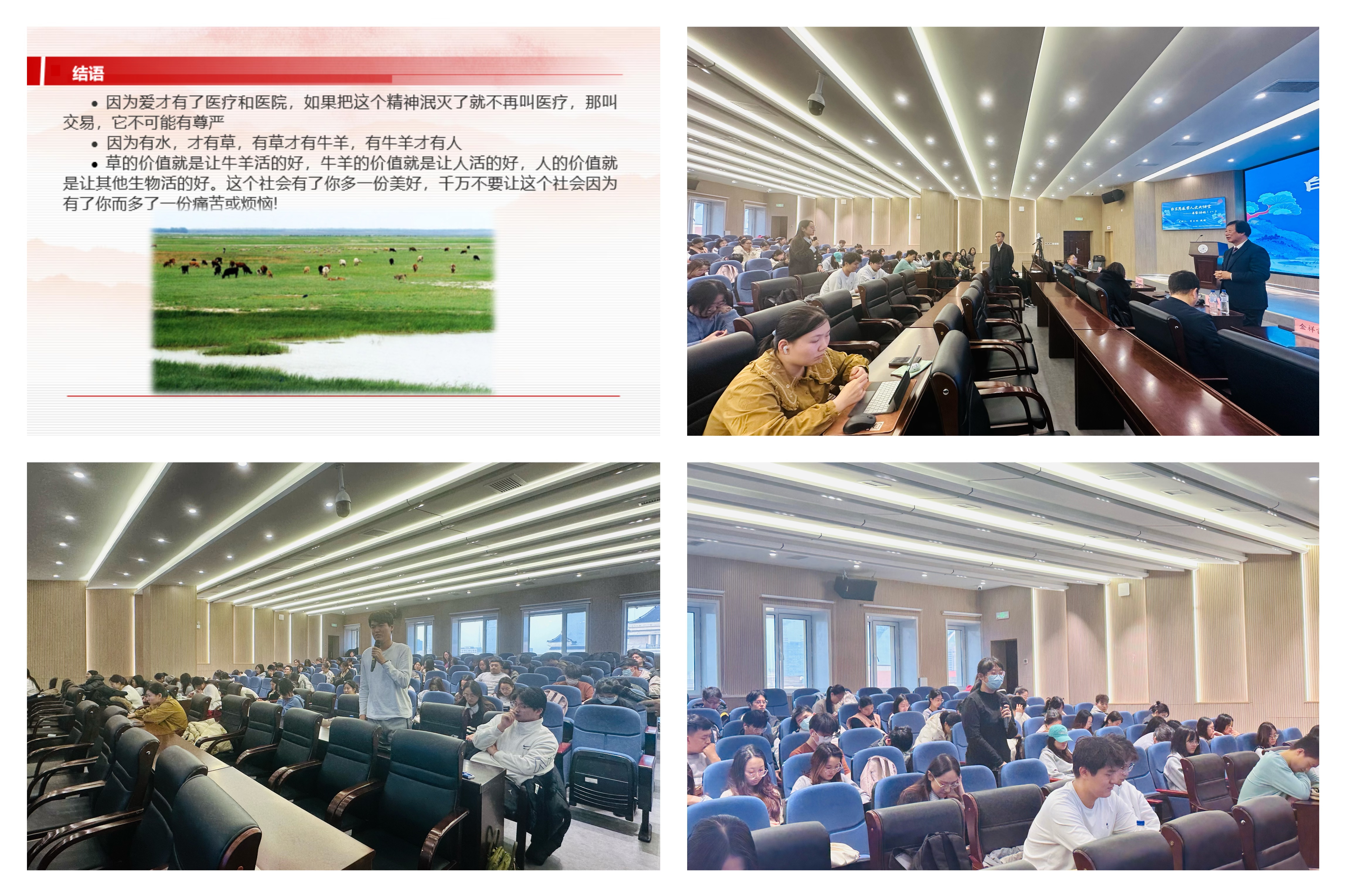 讲座尾声,李玉林教授分享了他工作途中拍摄的一张照片,并描述了照片中的水、草、牛羊和人等元素,并借此阐释,“因为有爱才有了医疗和医院,如果把这种精神泯灭了,就不再叫医疗;草的价值是让牛羊活得好,牛羊的价值是让人活得好,人的价值是让其他生物活得好,希望这个社会因为有了你而多一份美好”。同学们纷纷表示,今天的讲座让自己对医生的职业道德有了更深刻的认识;学校的发展历程和辉煌成就,深刻感受到传承白求恩精神的责任感;教授对科研、学习和兴趣爱好的平衡,让自己明白要成为全面发展、精神充实的人。