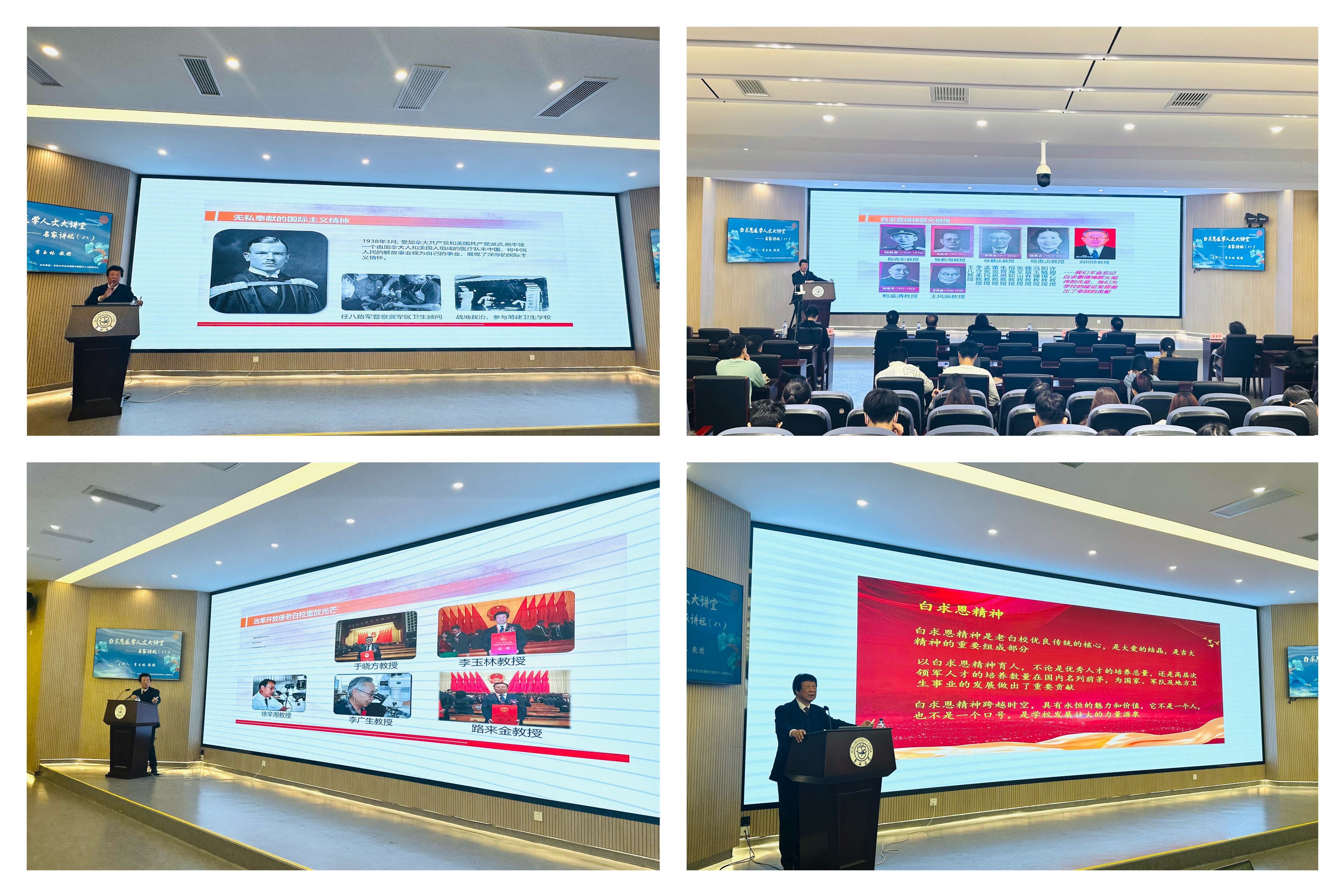 在“传承红色基因,让白求恩精神永放光芒”部分,李玉林解读其核心,即无私奉献的国际主义精神、毫不利己专门利人的精神、救死扶伤的革命人道主义精神。他分享三次赴加拿大白求恩故居经历,提及白求恩早年也曾有不足,但投身反法西斯战争后思想发生巨变,成为了值得中国人民敬仰的“同志”。在讲到学校医学教育发展历史时,李玉林教授通过展示殷希彭、鲍鉴清、王凤振、刘多三等老一代医学教育家的事迹,阐述了白求恩精神在学校的薪火相传,前辈们用实际行动践行了白求恩精神,为学校发展留下了宝贵的精神财富。改革开放后,学校迎来新的发展机遇,教学科研成果丰硕,培养多名教学名师、高等医学教育的翘楚、中国医学科技界的领军人物,他们在各自领域不断践行和弘扬着白求恩精神。