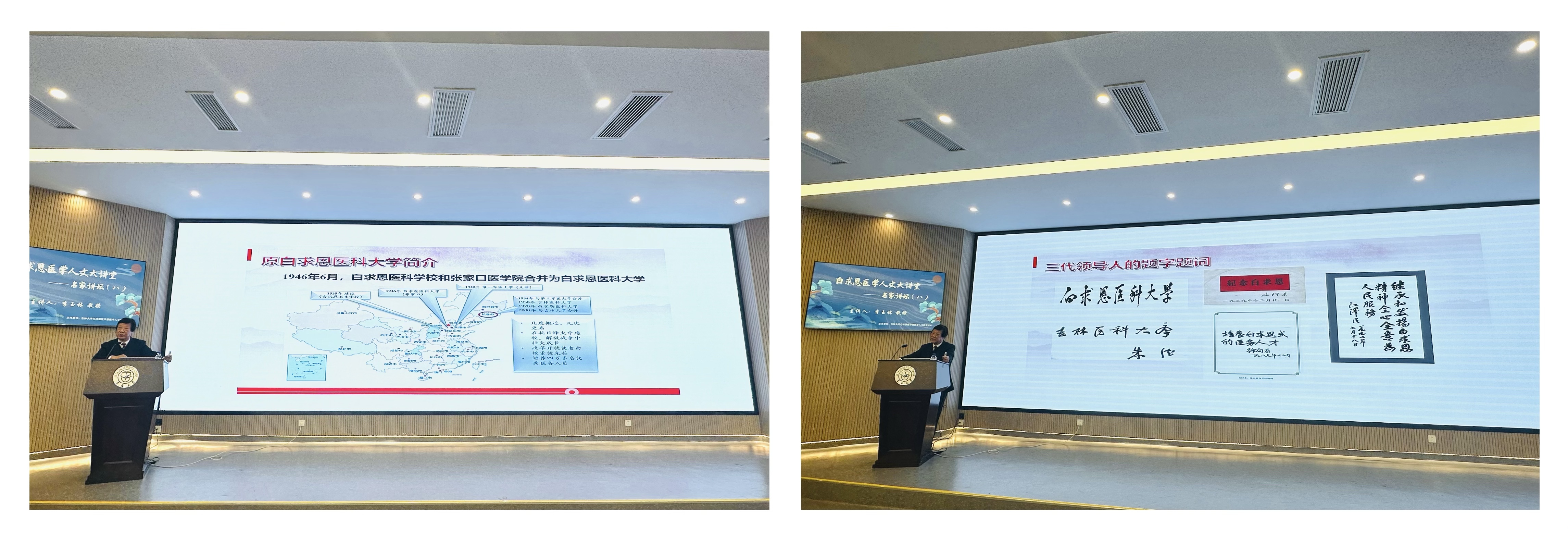 他梳理校史,1939年河北唐县建校,1946年命名白求恩医科大学,1958年转隶地方,1959年更名吉林医科大学,1978年恢复校名白求恩医科大学,2000年与吉林大学合并,培养了大量医务人员,为党和国家作出了卓越贡献。作为白求恩学子,必须铭记这段历史。