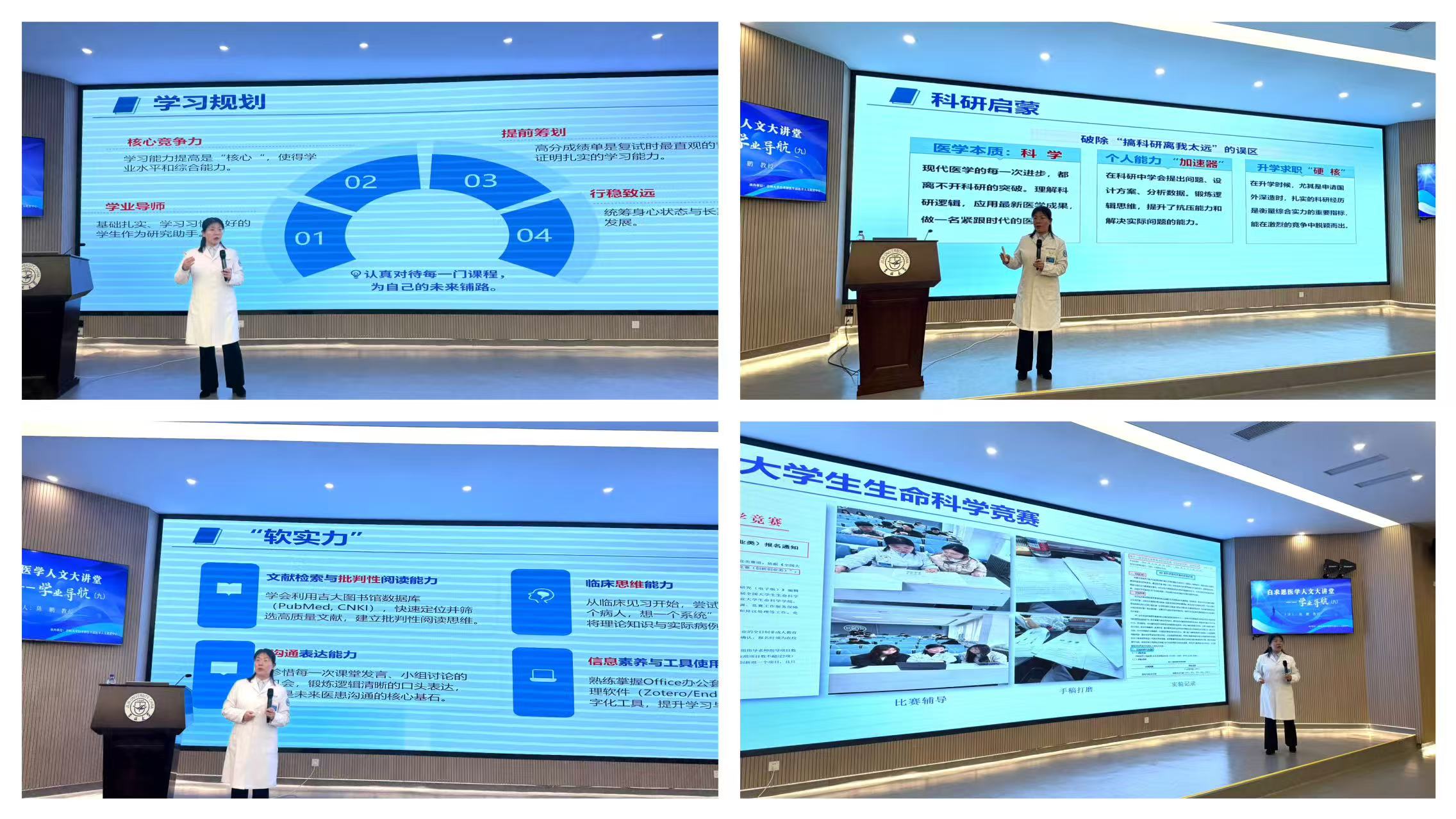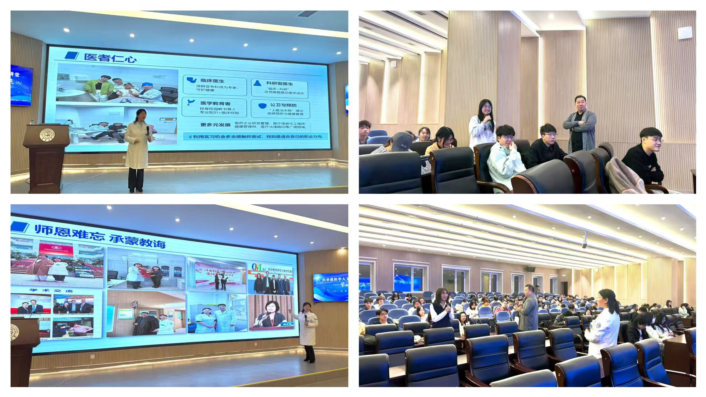 陈鹏教授的分享既有温度又有深度,既有个人成长的真挚感悟,也有学业科研的实用建议。她希望同学们要进一步明确人生发展方向,将每一个收获融入自身学习生活,努力成长为合格的医学人才,并将所学所悟传递给身边同学,共同在医学之路上稳步前行。本次讲座的成功举办,增强了同学们的专业自信和学习动力,为成为兼具专业素养与人文情怀的卓越医学人才提供了指引和方向。