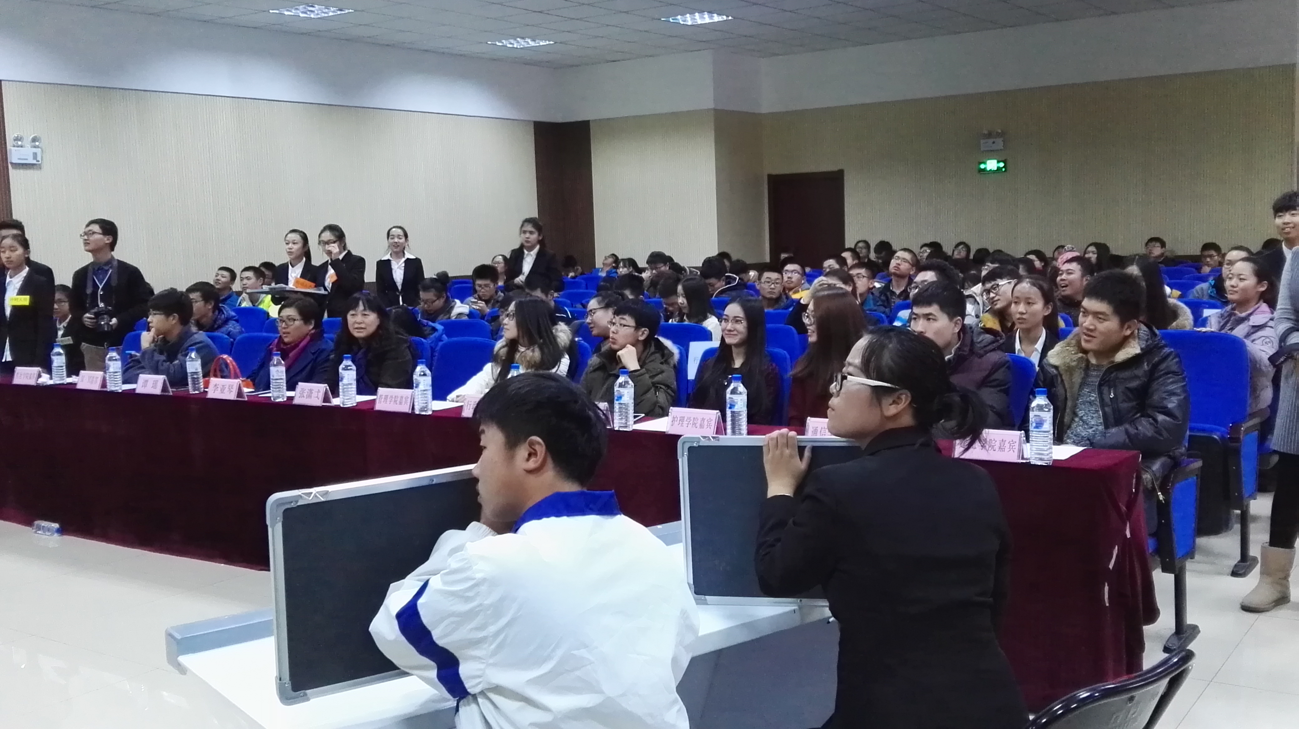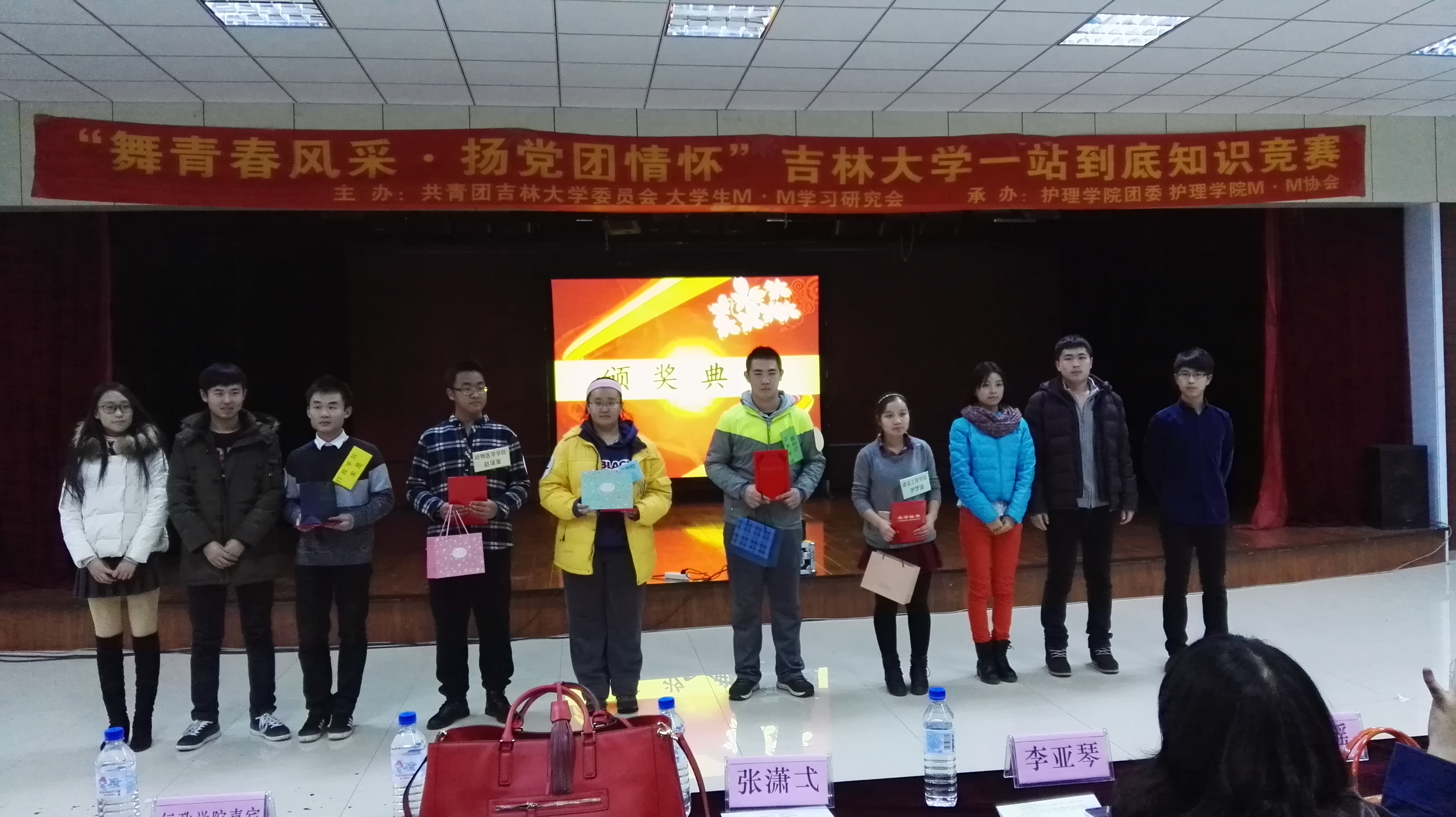 为了响应习近平总书记的号召,提高大学生党团意识,普及各领域科学文化知识,推动校园文化建设,提高大学生综合素质,由学院M.M研究会提出创意,吉林大学校团委倡议,在全校范围内开展“齐舞青春风采,共扬党团情怀”为主题的一站到底知识竞赛活动,我院团委及M•M学习研究会是此次活动的承办单位。经过长达三个星期初赛、复赛的筹备与比拼,最终于2015年11月29日在中心校区田家炳活动中心A座小礼堂顺利进行决赛并圆满落幕。出席本次大赛的嘉宾有护理学院学生工作办公室主任李亚琴、动物医学学院团委书记谭瑶以及其他六个学院团委副书记等。