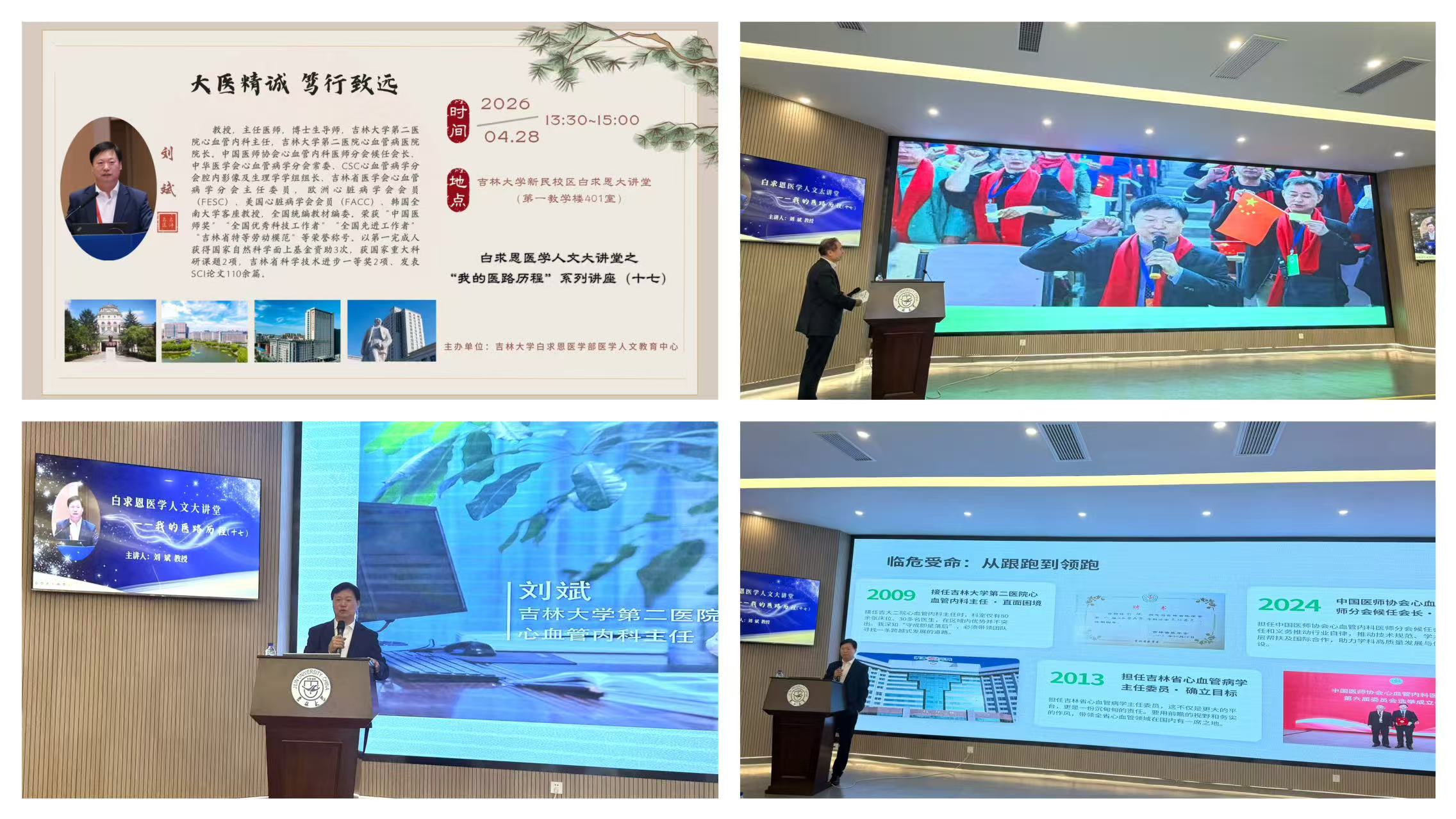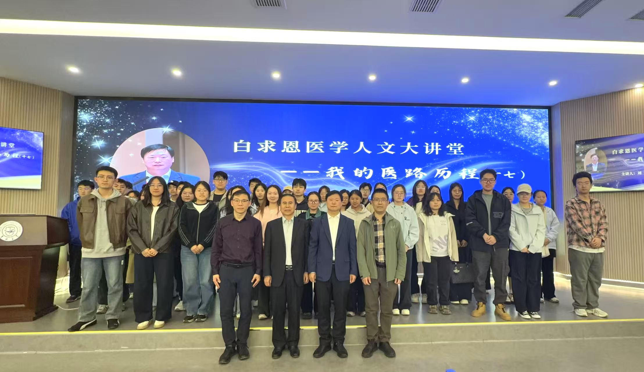4月28日,由白求恩医学部医学人文教育中心主办的白求恩医学人文大讲堂(2026年第2期)之“我的医路历程”第十七期讲座,在新民校区第一教学楼白求恩大讲堂顺利举行。本次讲座特邀吉林大学第二临床医学院刘斌教授担任主讲嘉宾,医学部相关教学单位的220余名本科生、研究生及教师代表现场参与,活动由医学人文教育中心主任于洗河主持。